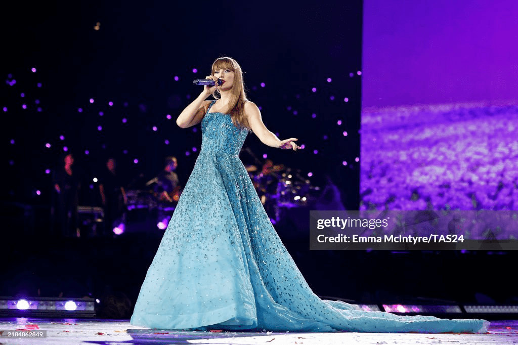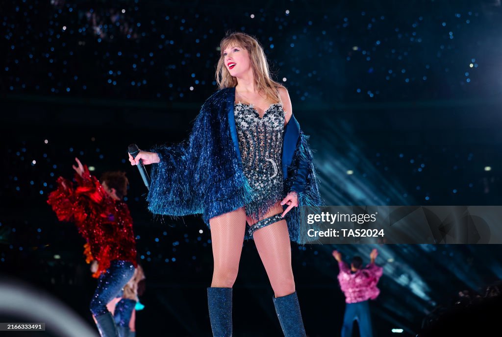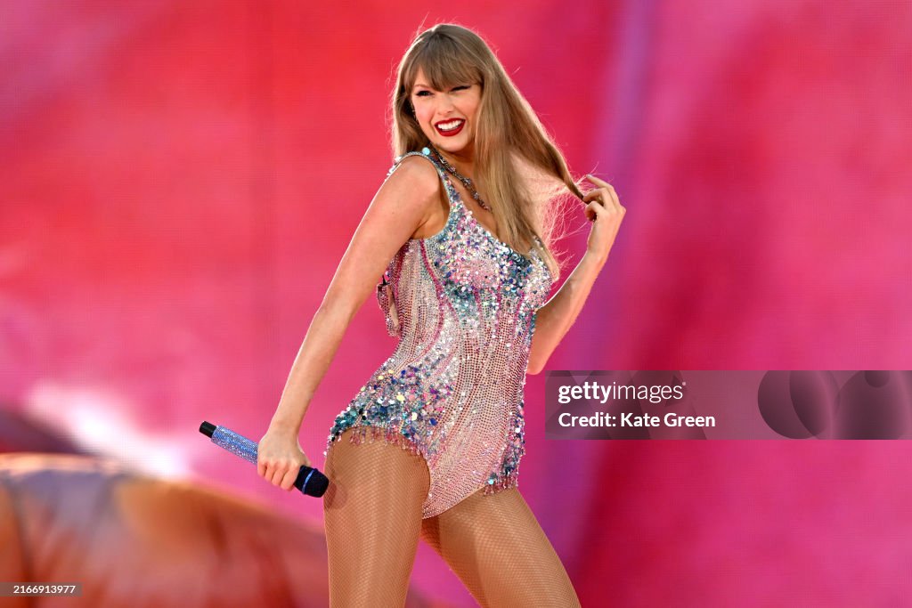 LONDON, ENGLAND – AUGUST 15: (EDITORIAL USE ONLY. NO STANDALONE PUBLICATION USE (NO SPECIAL INTEREST OR SINGLE ARTIST PUBLICATION USE; NO BOOK USE)) . Taylor Swift performs on stage during the “Taylor Swift | The Eras Tour” at Wembley Stadium on August 15, 2024 in London, England. (Photo by Kate Green/Getty Images)